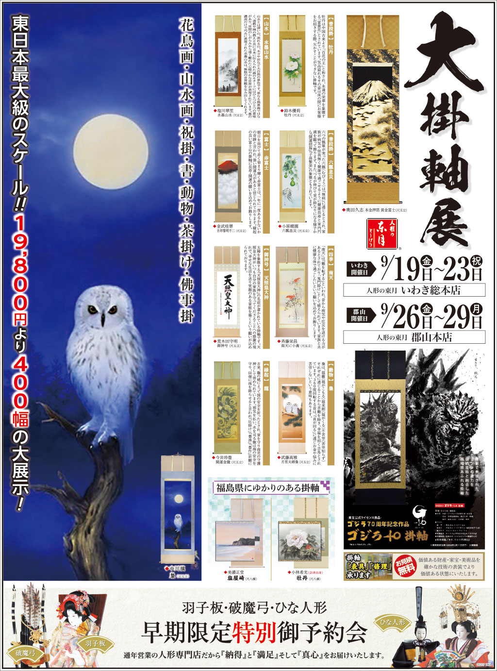 人形の東月は、福島県いわき市・郡山市で日本唯一の「炭胴のお雛さま」をはじめ、人形メーカーとして全国200件を超える人形師・地域専門メーカー・職人と融合。正月飾り・ひな人形・五月人形・美術工芸品の掛軸・リヤドロ・趣味の小物等々、東日本最大級の品揃えで常時展示しております。