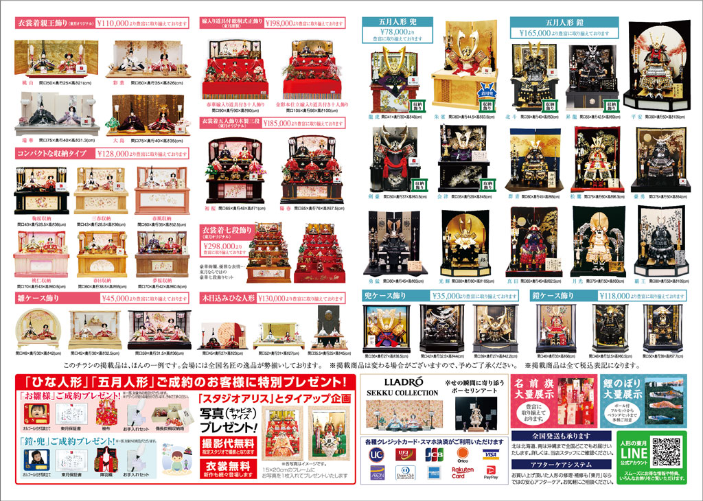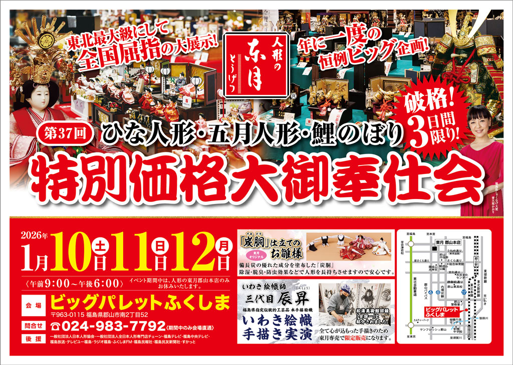 人形の東月は、福島県いわき市・郡山市で日本唯一の「炭胴のお雛さま」をはじめ、人形メーカーとして全国200件を超える人形師・地域専門メーカー・職人と融合。正月飾り・ひな人形・五月人形・美術工芸品の掛軸・リヤドロ・趣味の小物等々、東日本最大級の品揃えで常時展示しております。